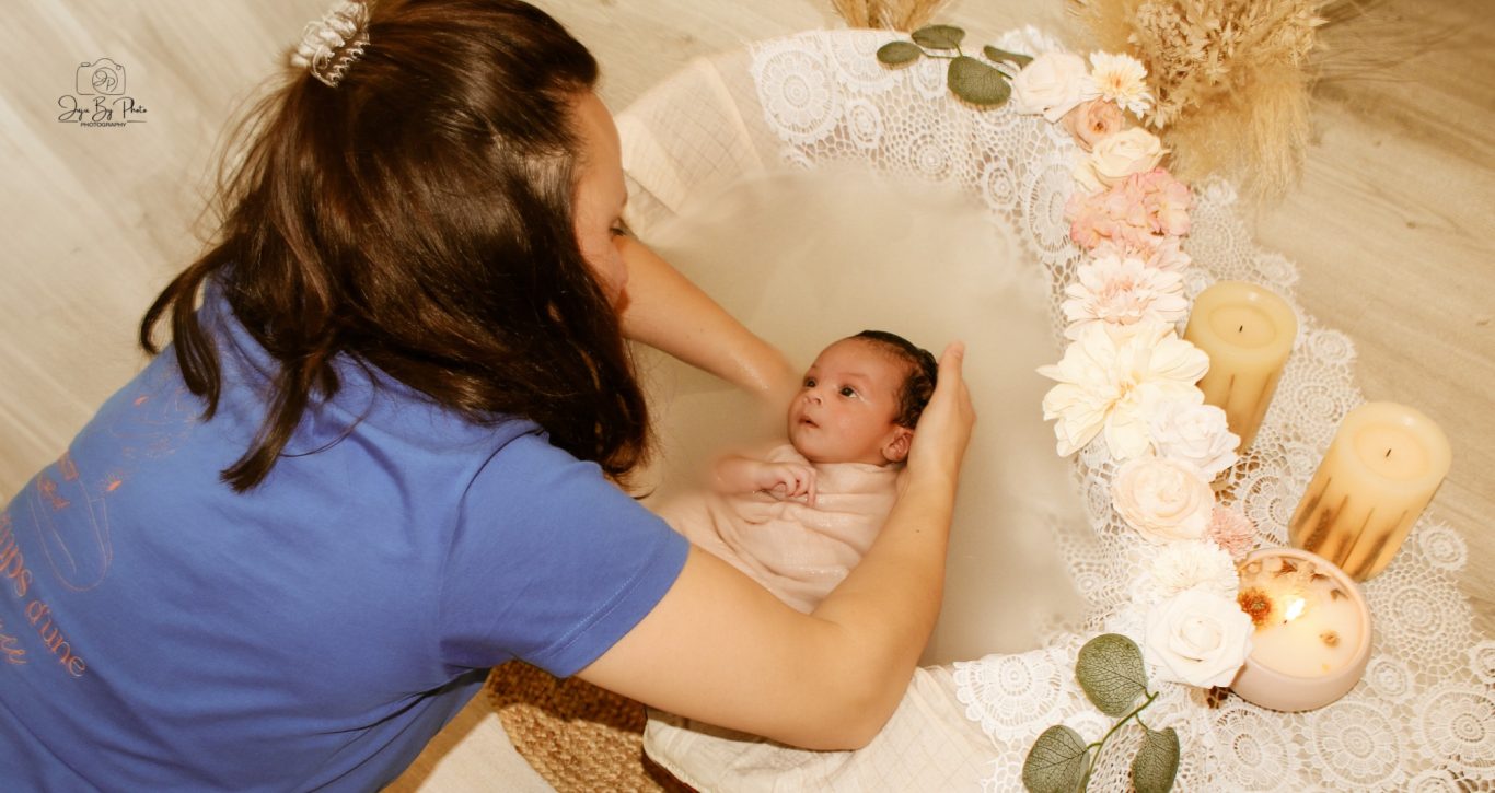 "Le troisième bain c’est cette confiance qui est acquise, cette connexion et ce partage encore plus puissant. C’est par conséquent un lâcher prise en quelques minutes et un bain encore plus magique que les deux premiers. Et ce qu’on ne voit pas, c’est un bébé tout sourire pour le reste de la journée signe d’un vrai apaisement. Merci Le Temps d'une Naissance Anne-Flore Ferreira pour ces moments forts en émotion "